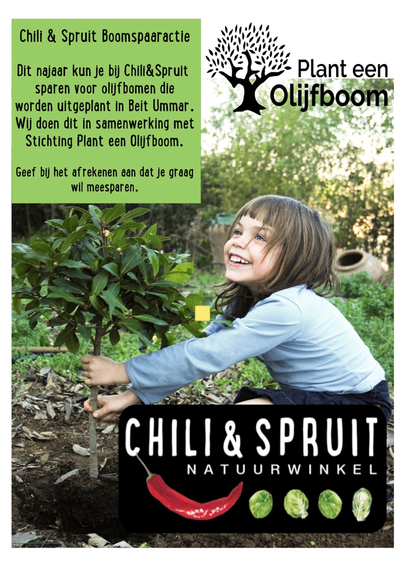 Van maandag 3 november t/m 31 december kun je punten sparen per elke 10,- die je besteedt bij Chili & Spruit. Voor elke 200 punten wordt er een boom geplant in Beit Ummar. Omdat we samen sparen tellen we de punten van alle klanten bij elkaar op en zijn de individuele stempelkaarten niet meer nodig. Wil je mee sparen? Geef dit dan bij het afrekenen aan.